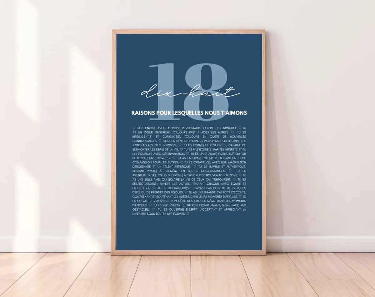 Vous cherchez un cadeau original et touchant pour célébrer les 18 ans de votre proche ? Notre affiche bleue pour anniversaire de 18 ans est la solution idéale. Élaborée avec soin et pleine d’émotion, cette affiche énumère 18 raisons pour lesquelles nous aimons cette personne exceptionnelle. Téléchargeable instantanément, elle est disponible au format numérique et peut être imprimée dans différentes tailles selon vos préférences.