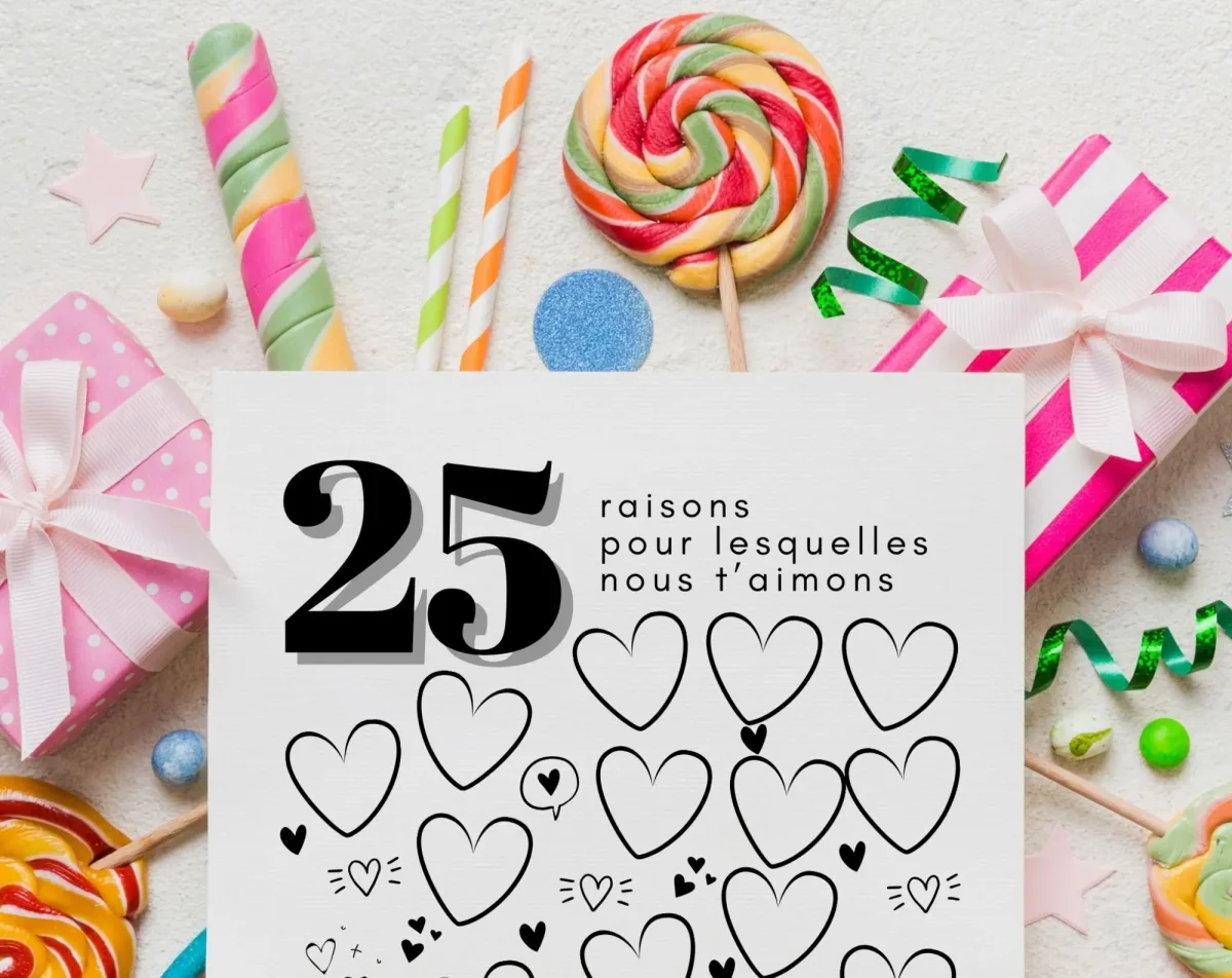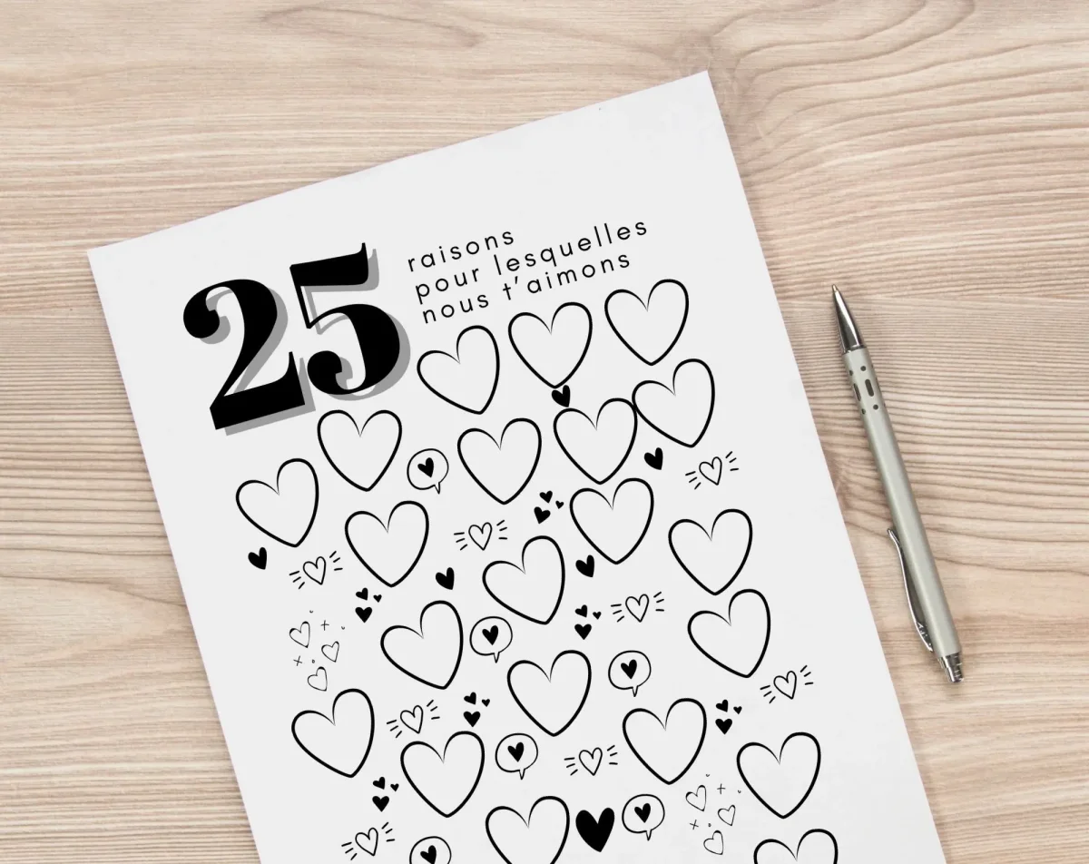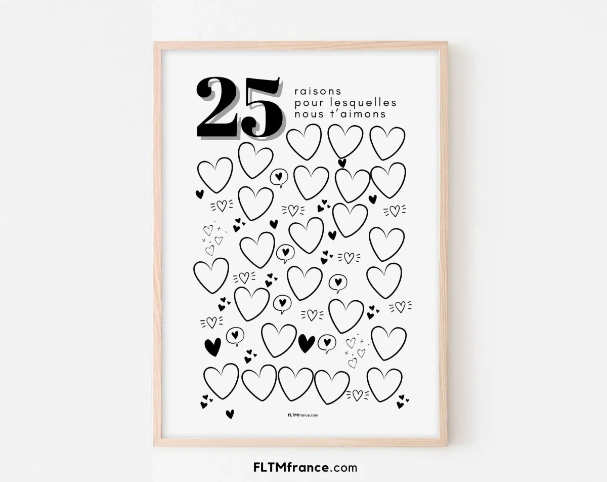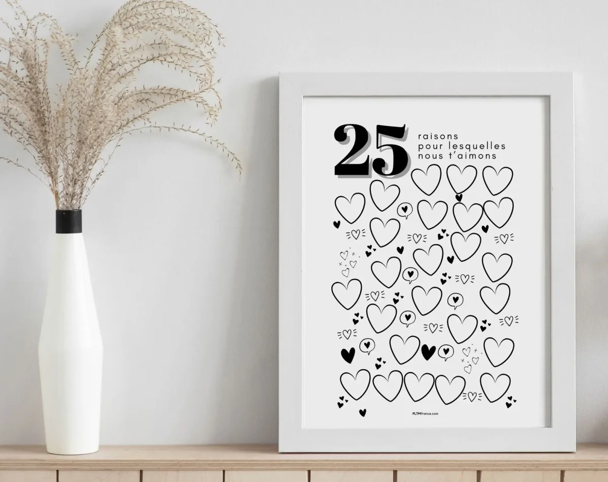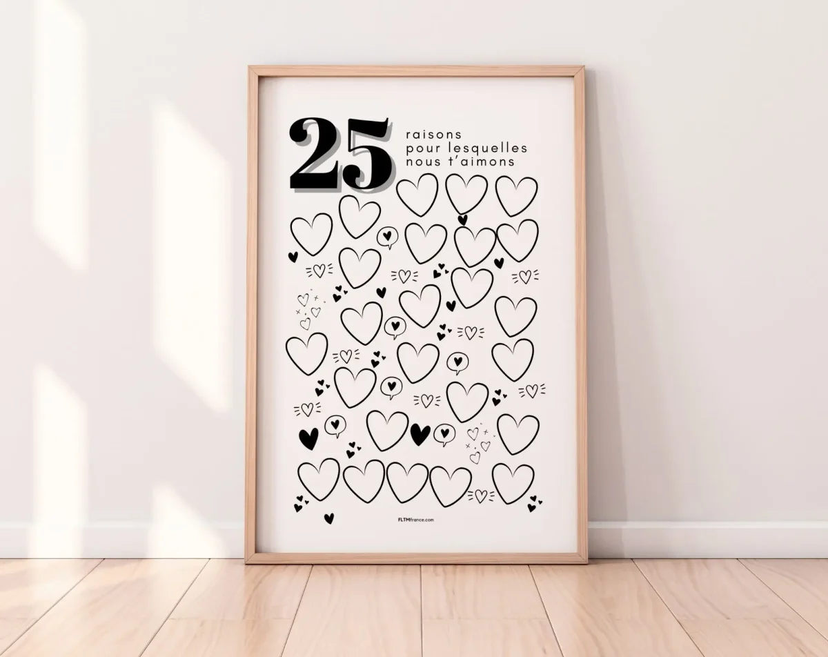 Une fois imprimée, l’affiche 25 raisons pour lesquelles nous t’aimons devient une toile pour votre créativité. Vous pouvez personnaliser chaque espace prévu pour écrire les textes en ajoutant vos propres raisons, messages, ou anecdotes spéciales. Cette flexibilité permet de rendre l’affiche encore plus personnelle et significative, transformant un simple achat en un cadeau rempli d’émotions.
