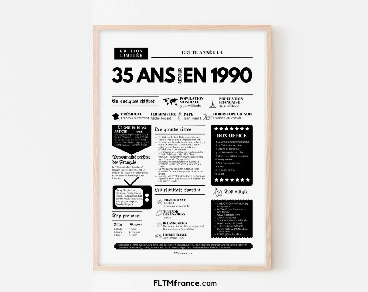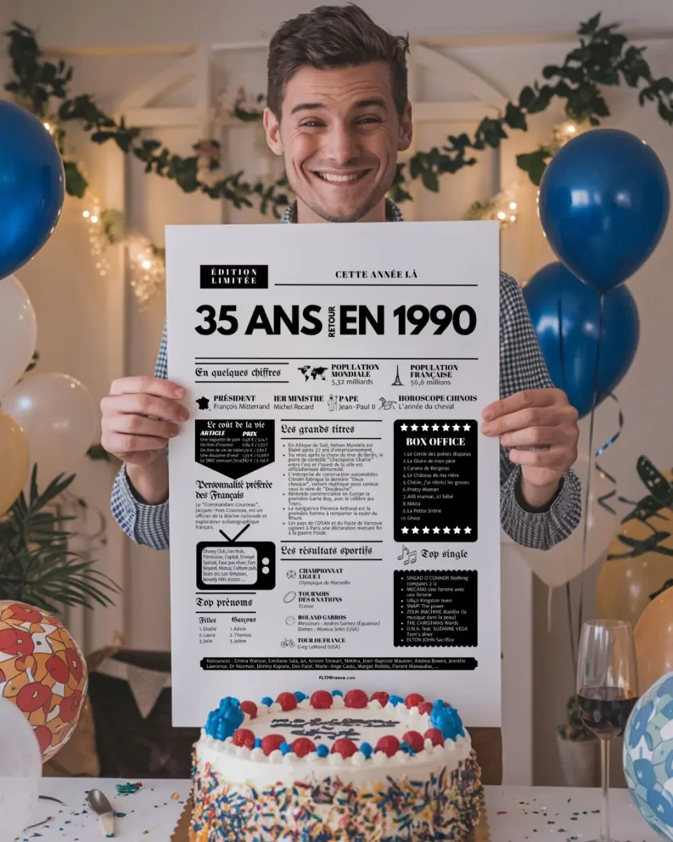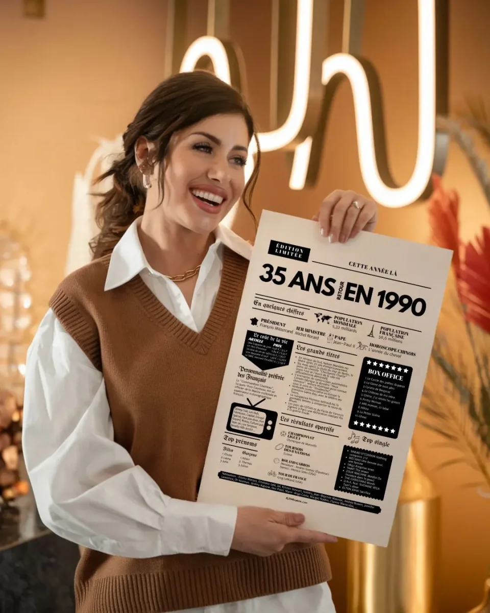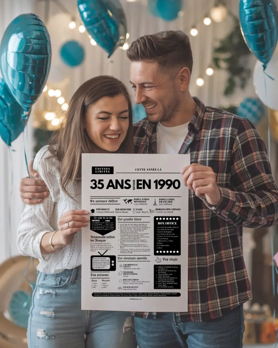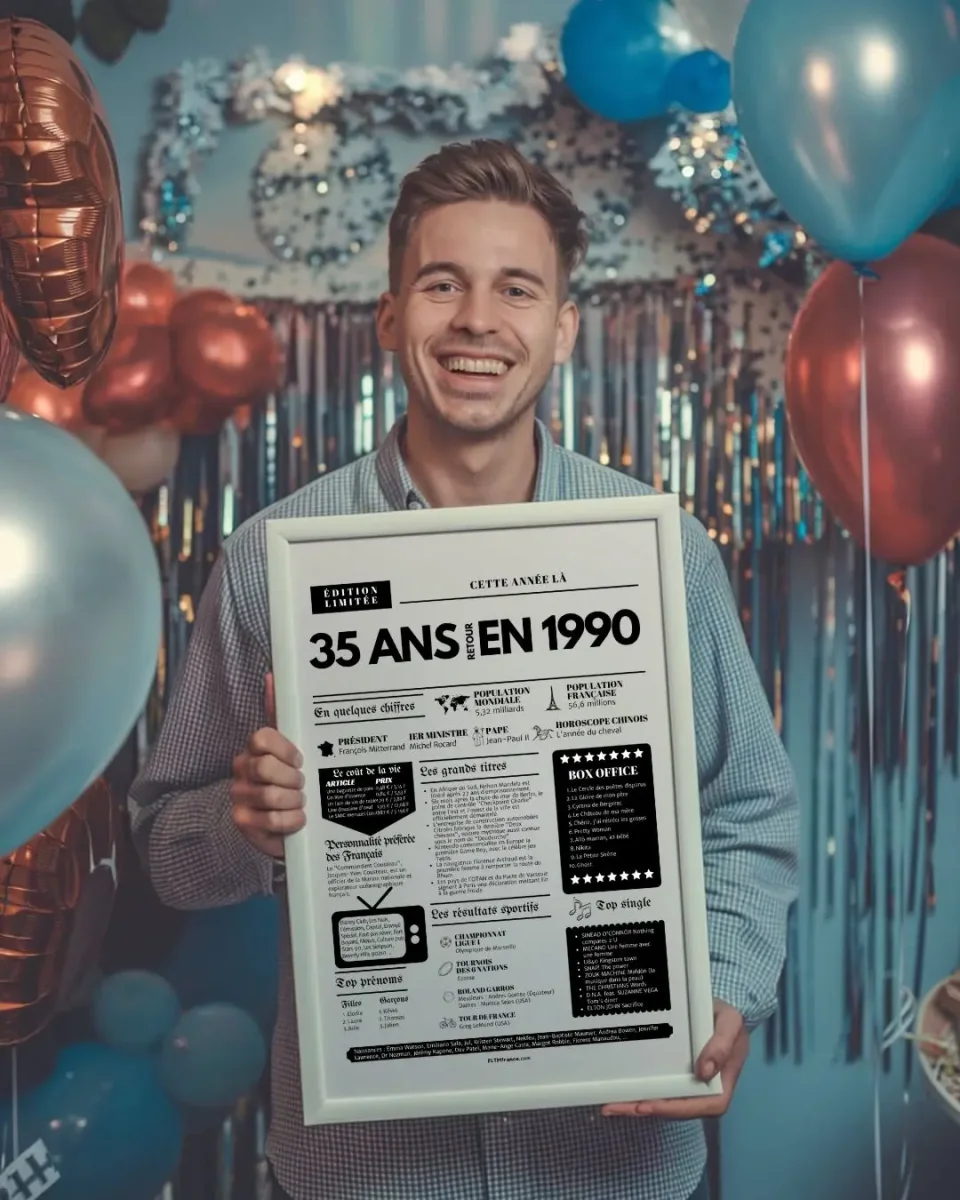 Célébrez les 35 ans d’un proche ou d’un ami en revisitant l’année 1990 grâce à l’Affiche 35 ans retour en 1990 – Journal de l’année. Cette création unique met en lumière les faits marquants, les tendances et les moments mémorables de 1990, dans un style rétro et élégant. Parfaite pour enrichir la décoration d’une fête d’anniversaire ou offrir un cadeau original, cette affiche replonge vos invités dans l’ambiance de cette année spéciale.