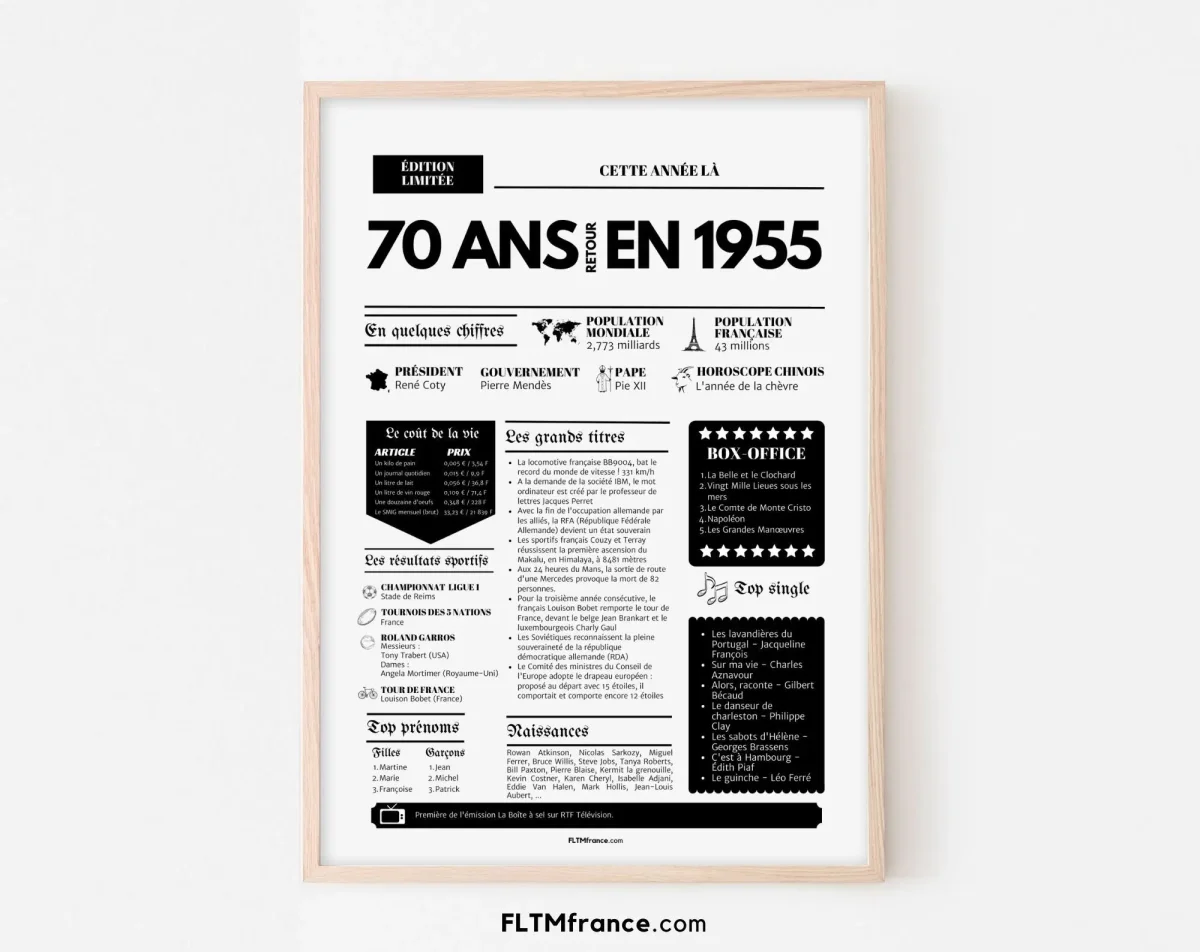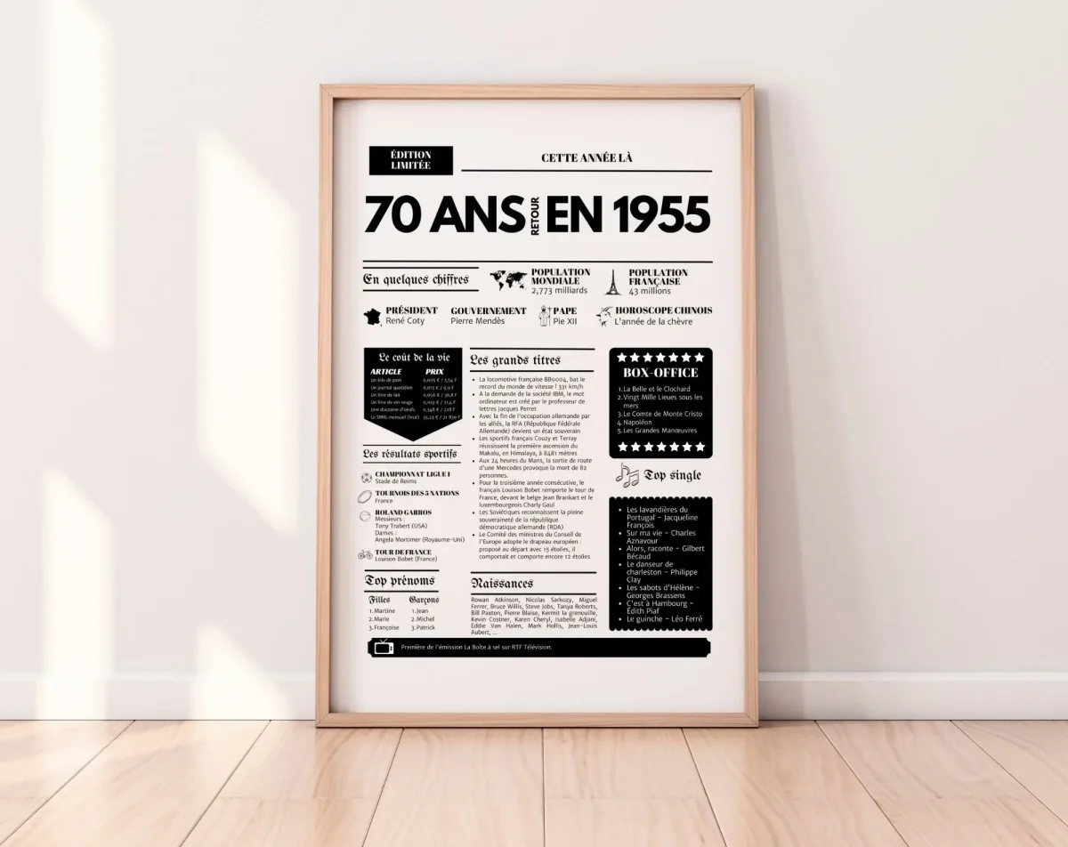 L’Affiche 70 ans retour en 1955 – Journal de l’année est une décoration parfaite pour immortaliser un anniversaire marquant. Que ce soit pour enrichir une fête ou offrir un cadeau original, cette affiche replonge dans l’ambiance de 1955 avec style et nostalgie.
