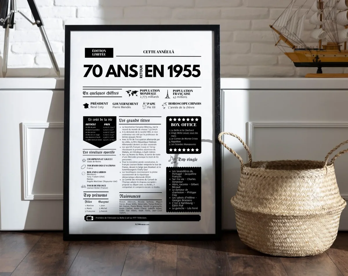 Faites un saut dans le passé et célébrez les 70 ans d’un proche ou d’un ami avec l’Affiche 70 ans retour en 1955. Ce journal rétro unique retrace les événements marquants, les tendances culturelles et les anecdotes emblématiques de cette année mémorable. Idéale pour enrichir la décoration d’une fête d’anniversaire ou comme cadeau intemporel, cette affiche replonge dans l’univers de 1955 avec élégance et nostalgie.