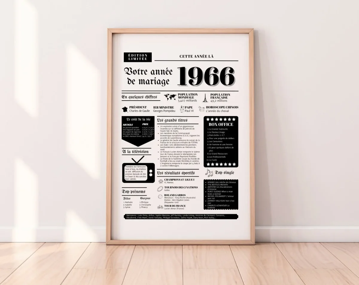 Nos affiches, dédiées à l’année de mariage 1966, sont conçues pour apporter une touche de nostalgie et d’élégance à votre intérieur. Elles sont non personnalisables, offrant ainsi un design intemporel qui a été soigneusement sélectionné pour refléter l’esthétique et les valeurs de cette époque particulière. Le style vintage de l’affiche ajoute une touche de charme rétro qui rappelle les moments heureux passés ensemble.