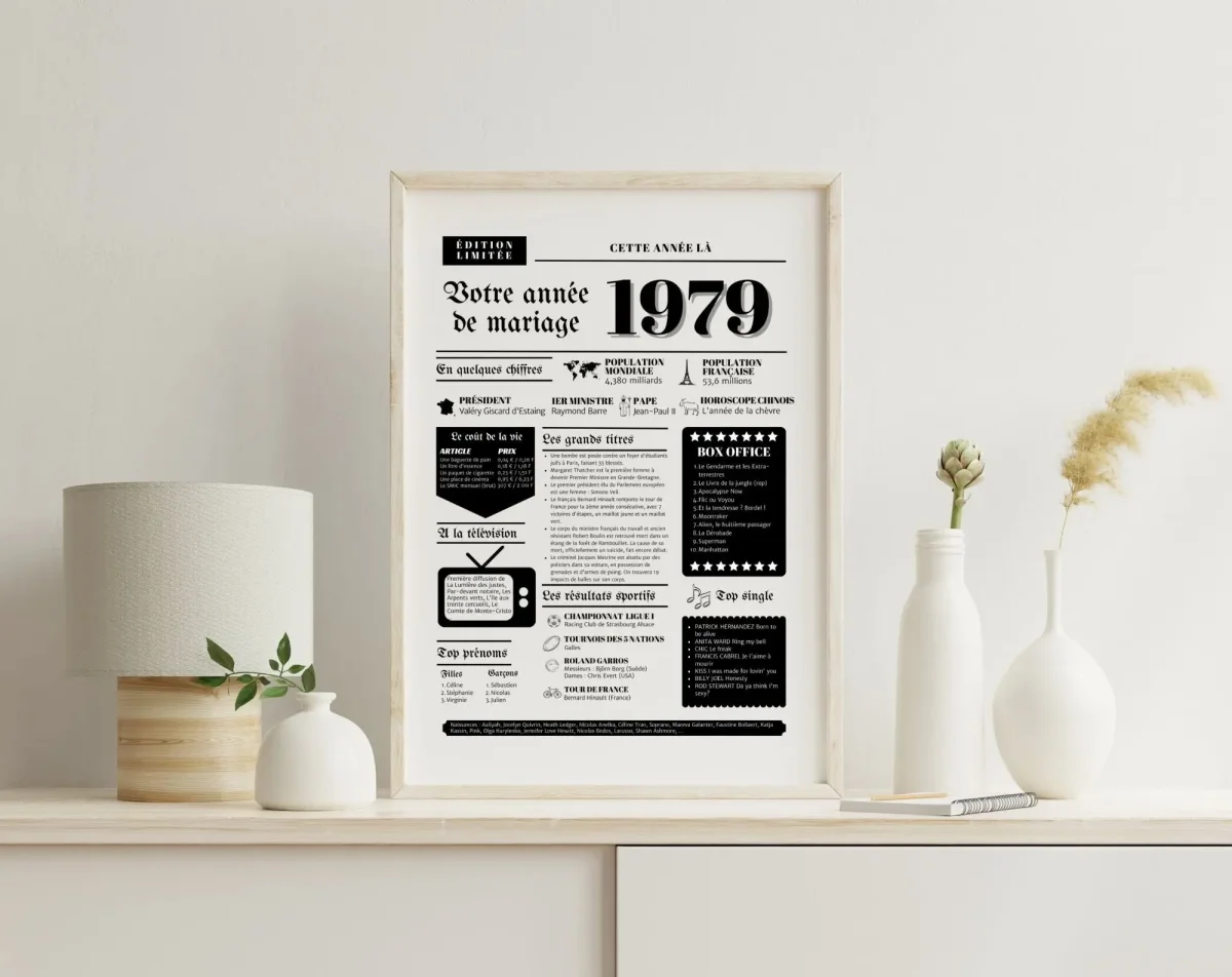 Vous cherchez une idée cadeau originale ? L’affiche année de mariage 1979 est une excellente option. Offrez à vos proches un souvenir unique et personnalisé de leur année de mariage. Cette affiche est une façon touchante et élégante de célébrer un anniversaire de mariage ou de faire plaisir à un être cher.