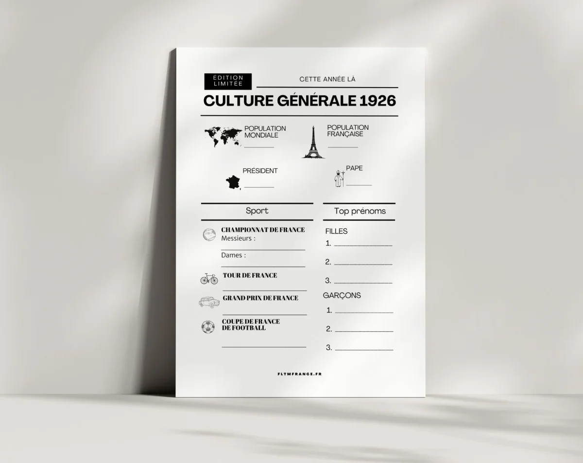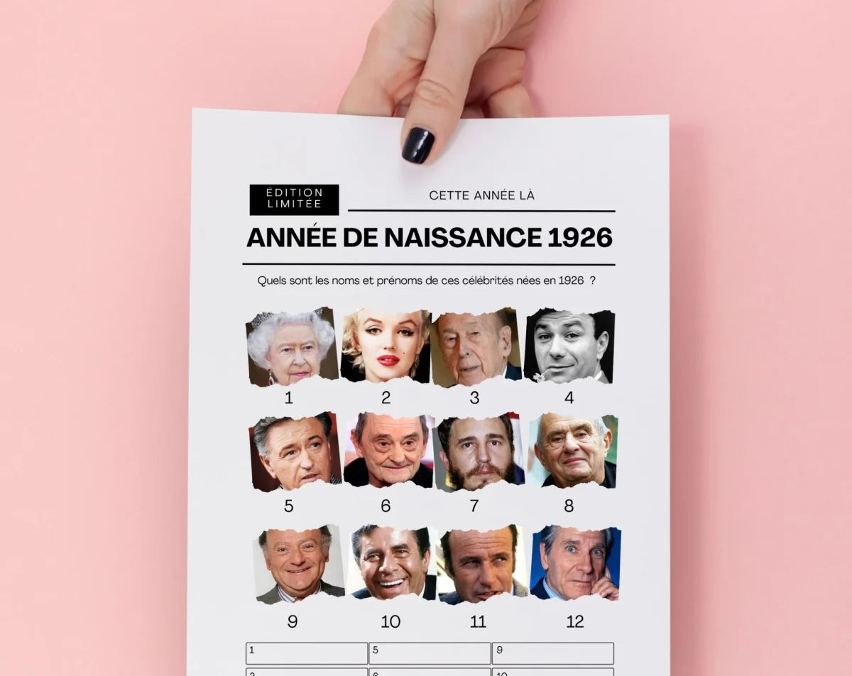 En 2026, on célèbre les 100 ans des personnes nées en 1926 🥳 Pour marquer ce moment exceptionnel, FLTM te propose un jeu anniversaire clé en main, à télécharger et imprimer, qui replonge toute la famille dans les souvenirs et les grands événements de cette année mythique.