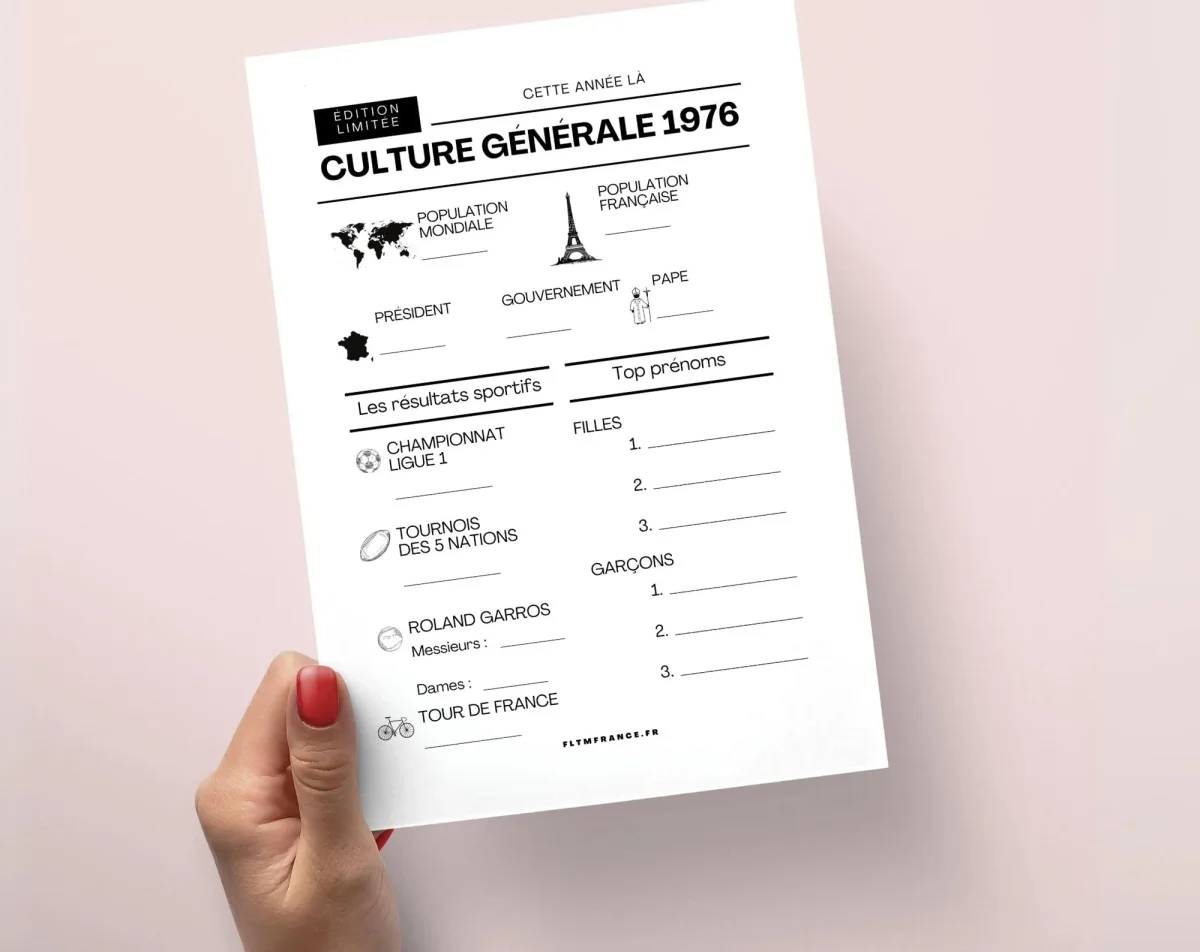 Ravive la magie des années 70 avec le Jeu anniversaire 1976, une création FLTM, la référence des jeux et affiches à imprimer pour toutes les générations 🎈