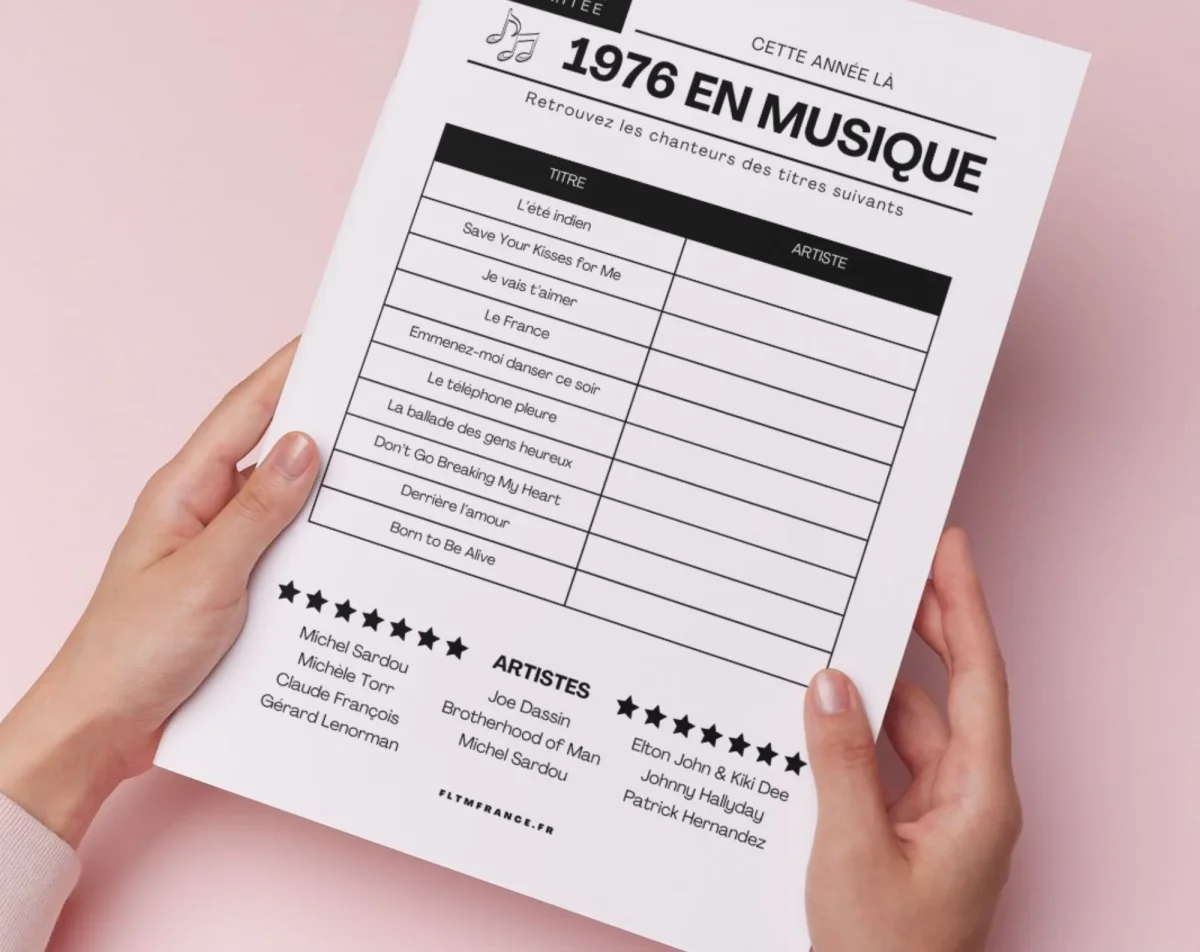 En 2026, place à la fête pour toutes les personnes nées en 1976 🥳 Ce jeu anniversaire à imprimer signé FLTM te replonge dans les années 70 : paillettes, tubes disco, films cultes et grands moments d’histoire. Une animation amusante, prête à imprimer, pour célébrer un demi-siècle de souvenirs dans une ambiance rétro, conviviale et pleine de bonne humeur ! ✨
