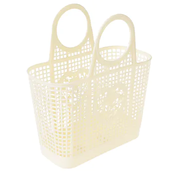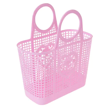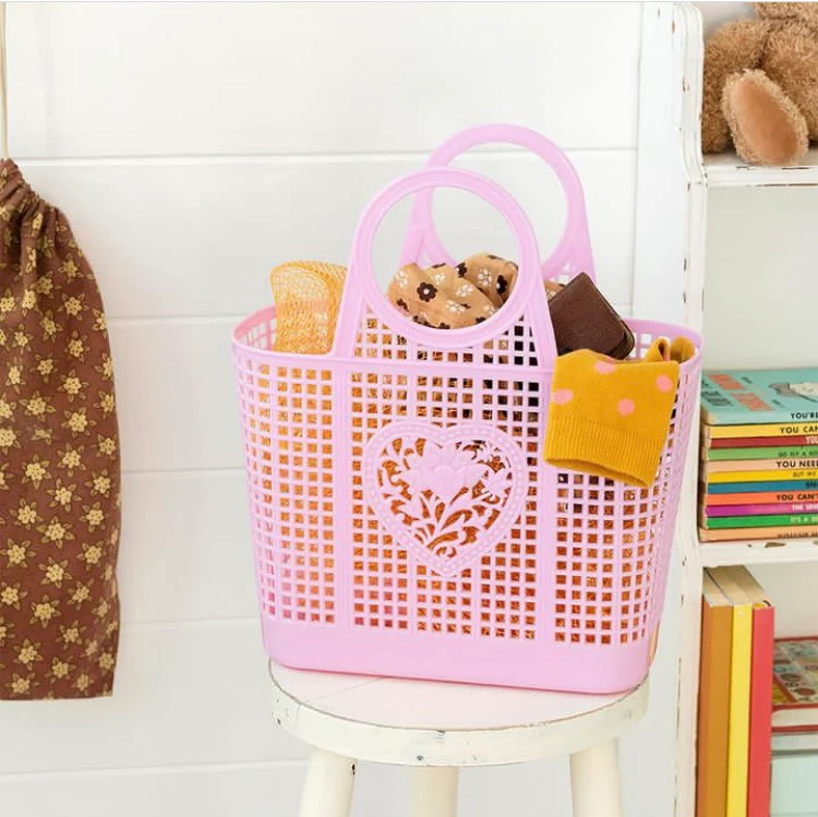 Un panier en plastique souple dans un aqua pastel doux, avec des décorations de cœur et de fleurs de chaque côté.