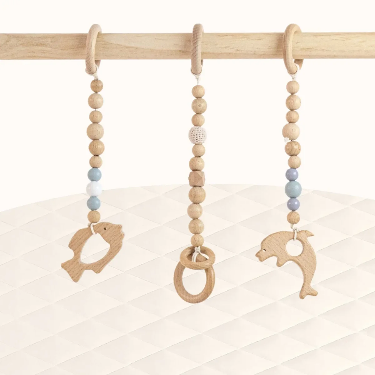 Unlike plastic activity gyms with overwhelming colors and electronic sounds, our Fishs Play Gym Set respects your baby’s natural developmental pace. The simple wooden rings encourage focused interaction and authentic discovery—allowing your little one to build concentration and independence from their earliest days.