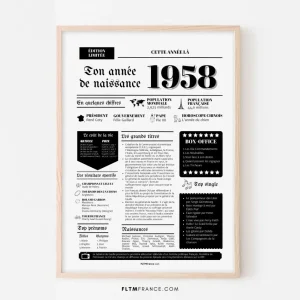 Affiche année de naissance 1958 – Cadeau anniversaire 67 ans