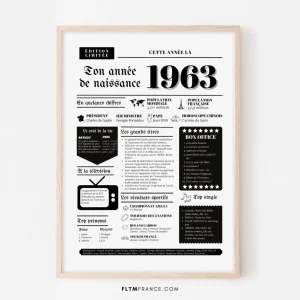 Affiche année de naissance 1963 – Cadeau anniversaire 62 ans