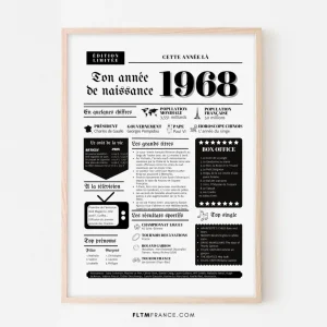 Affiche année de naissance 1968 – Cadeau anniversaire 57 ans