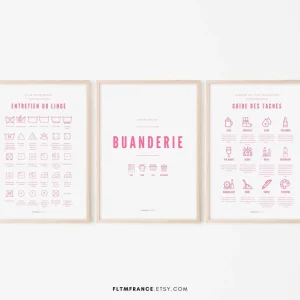 3 affiches rose Buanderie, Entretien du linge et Guide des taches