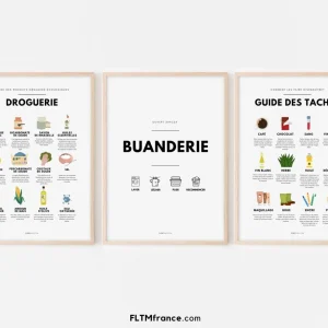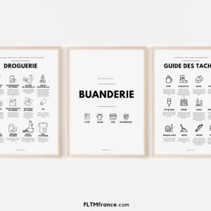 3 affiches Buanderie, Guide des taches et droguerie